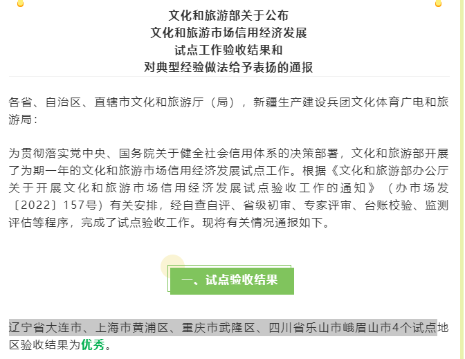蓝本是重庆旅游标杆——武隆,上榜世界文旅部信用经济发展试点优秀榜单,世界仅辽宁省大连市、上海市黄浦区、重庆市武隆区、四川省乐山市峨眉山市4个试点被评为优秀,重庆武隆即是其中一个。