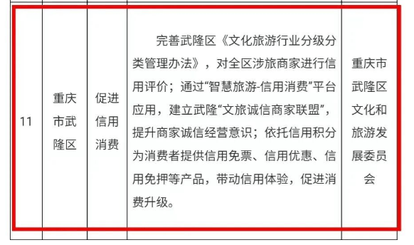 行为典型被给以通报表扬确定,重庆武隆实至名归。武隆区为促进信用摧折,完善了武隆区《文化旅游行业分级分类惩处观点》,对全区涉旅商家进行信用评价;通过“机灵旅游-信用摧折”平台期骗,开荒武隆“文旅诚信商家定约”,升迁商家诚信指标坚硬;依托信用积分为摧折者提供信用免票、信用优惠、信用免押等家具,带动信用体验,促进摧折升级。