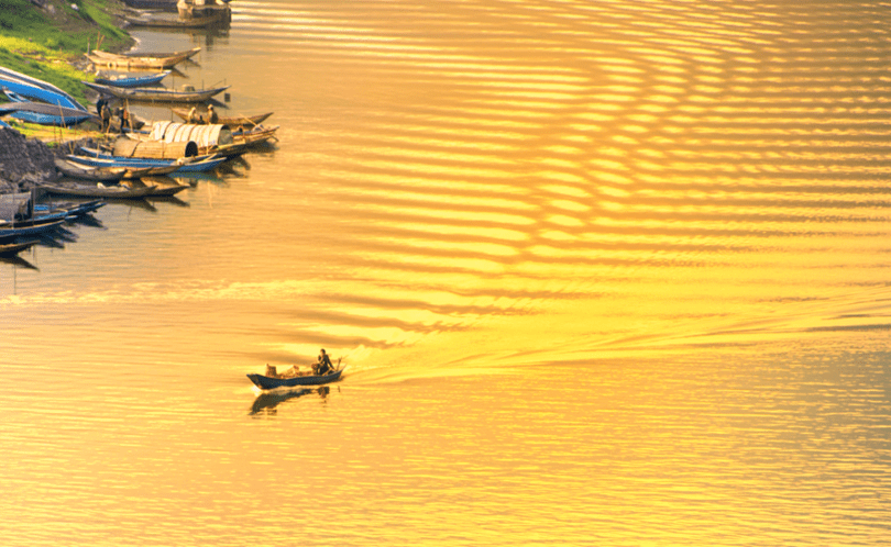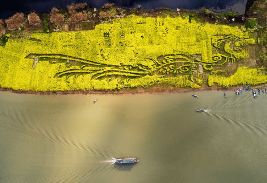 每年三月,新安江山水画廊满岸金黄。金黄的花海照射着水波漂泊的江面,表露的江水环绕村庄,三两小舟穿行其中,与一派白墙黑瓦的徽派民居交相衬映。循吐花香寻觅,不错看到油菜花田劈头盖脸层层冉冉,两岸徽派房屋影影绰绰,犹如浓墨淡彩的水墨画卷。